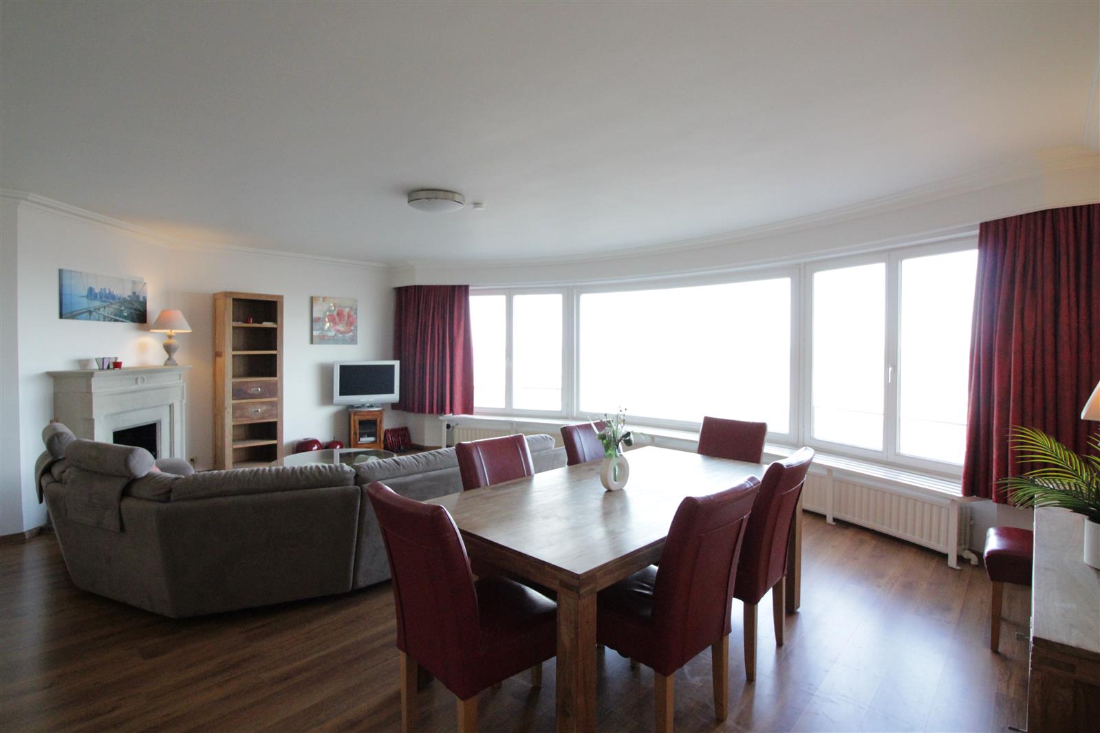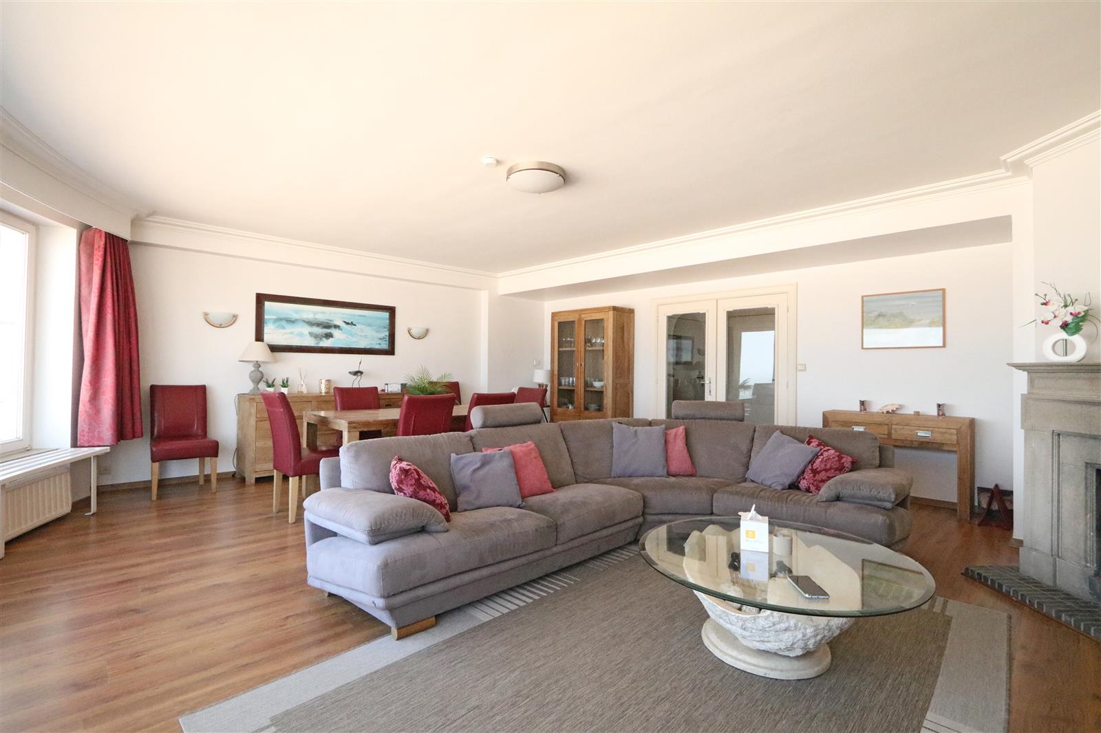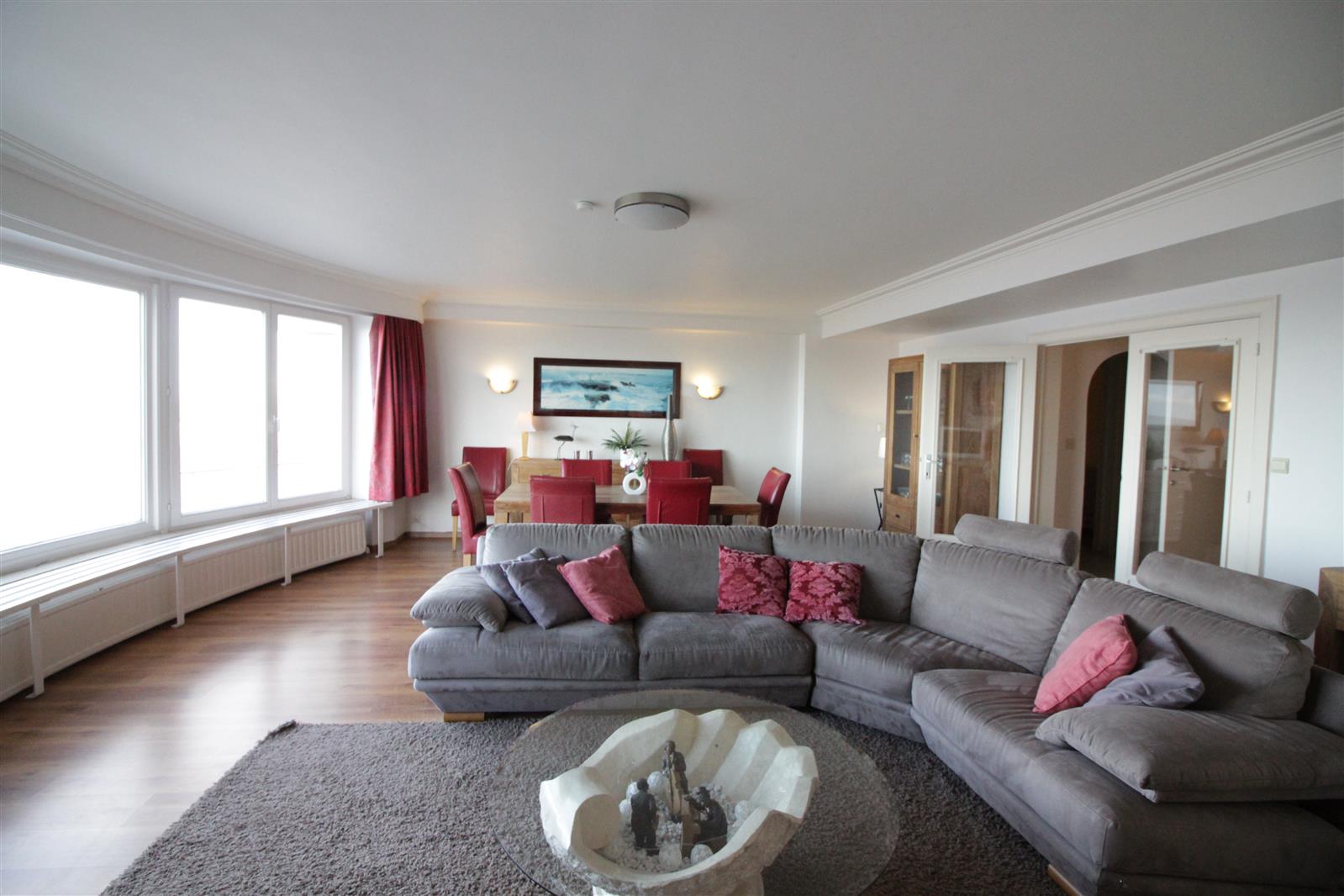 Ruim 4-slaapkamer appartement op de Zeedijk in hartje Zoute. Prachtig zeezicht. Zonneterras ter hoogte van de slaapkamers. Staanplaats in het gebouw.
